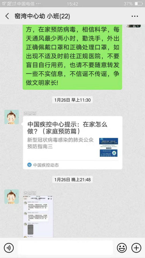 积极行动,利用新媒体,在家长微信群推送政府部门和教育局发布的有关疫情资讯,做好科学防治宣传教育工作,不信谣,不传谣,不参加任何形式的聚集性活动,做好家庭预防消毒工作。为有效防控疫情扩散,教师在各班级群每天给孩子和家长们分享一些适合假期在家做的一些亲子游戏活动,推送适宜的绘本故事等等,丰富孩子们的假期生活。同时学校要求各位教职工听从学校安排,积极配合、主动作为,打赢疫情阻击战,让广大师幼和家长们提高思想认识、加强自我防范意识,积极配合应对疫清,最大限度减少新型冠状病毒肺炎对广大师幼身心健康造成危害。