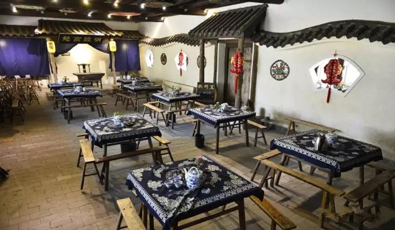 坐落在江南水乡窑湾古镇上这家“陆家茶楼”人们说它凝固着旧时光。这是真正的老茶馆,简单,却不失特色。茶馆不大,老式木架结构,房梁参差不齐,正面墙壁上都是富有年代感的装饰,戏台子上有时说书,有时唱书。一把老式的方桌和靠椅透露着其独特的年代感,氛围显得惬意慵懒。屋顶几盏老式吊灯射下来的光线与那三三两两的老茶客们交相辉映,台下一张张老式条凳,方形老木桌,上面盖着蓝色大衿桌布,让人感觉到窑湾最原汁原味的文化色彩,等待着这里的着有心人去细细品味。