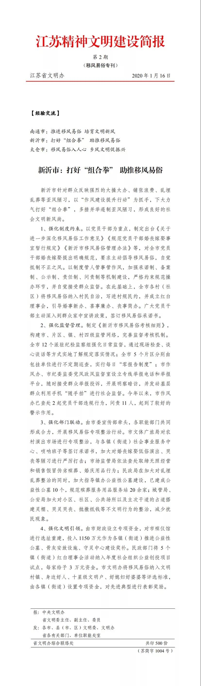 近年来,新沂市在移风易俗工作上出重拳、动真招,取得了显著的成效,移风易俗工作经验被《江苏精神文明建设简报》刊发。