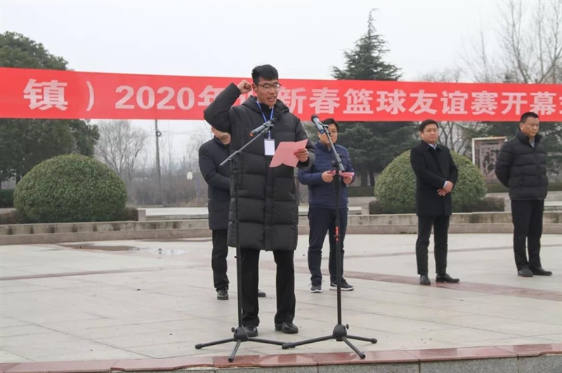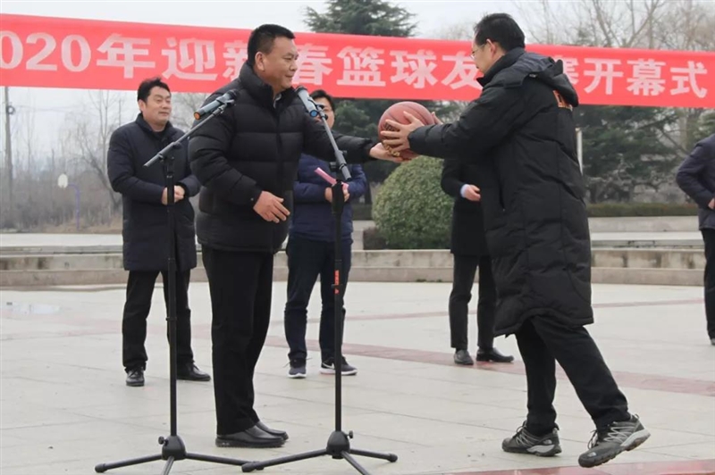在裁判员、运动员代表宣誓之后,由新沂市文化体育局旅游局局长卞光明宣布2020年迎新春篮球友谊赛开幕,并向裁判授球。