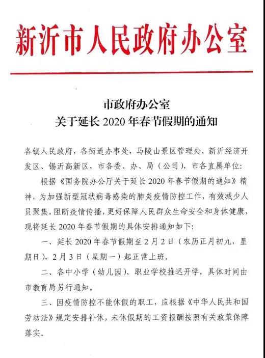 中共中央政治局常委、国务院总理、中央应对新型冠状病毒感染肺炎疫情工作领导小组组长李克强26日主持召开领导小组会议,贯彻习近平总书记重要讲话和中央政治局常委会会议精神,进一步部署疫情防控工作。 为进一步控制疫情,中央决定延长春节假期。新沂人民政府率先发布延长假期通知: |