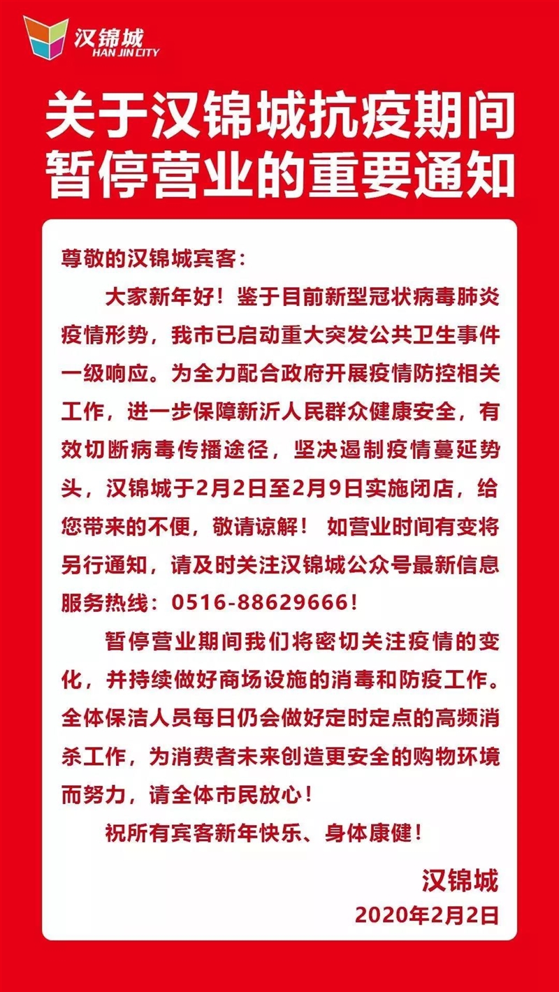 为做好新型冠状病毒疫情防控工作,有效切断病毒传播途径,坚决遏制疫情蔓延,本着对全市顾客及全体商户的健康安全负责的精神 ,新沂悠沃时尚街区决定将于2月2日至2月9号实施闭店。