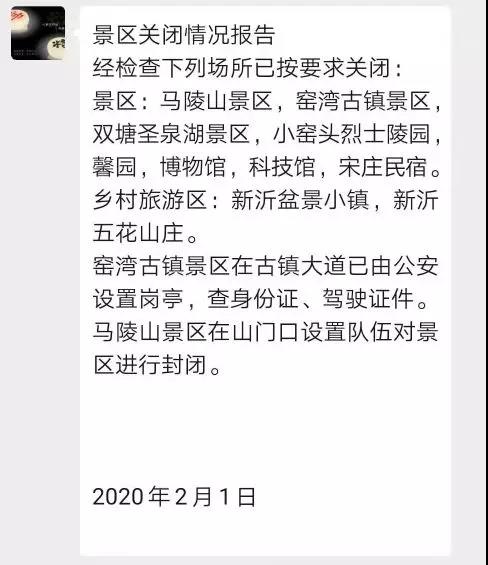 3.全市6家A级景区,马陵山、窑湾、圣泉湖、博物馆、小窑头、馨园,均已暂停营业并张贴公告;乡村旅游点,小青山桃园,盆景小镇,五花园生态园,茶文化博览园均暂停营业并张贴公告;5家星级酒店均已暂停营业,并张贴公告;27家旅行社除7家旅行社备案报停,正常营业的20家旅行社均已暂停营业;另外宋庄民宿、科技馆等景点均已关闭;圣泉湖花灯、阿湖花灯、迎春惠民灯会、马陵山庙会等活动均已取消;