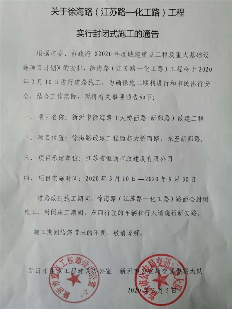 根据市委、市政府《2020年度城建重点工程及重大基础设施项目计划》的安排,徐海路(江苏路-化工路)工程将于2020年3月10日进行道路施工,为确保施工顺利进行和市民出行安全,结合工作实际,现将有关事项通告如下: