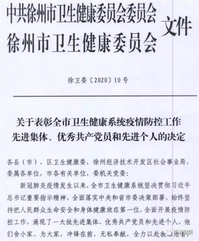为鼓舞士气,表彰先进,弘扬正气,激励广大卫生健康工作者投入抗击新冠疫情这场严峻的斗争,徐州卫生健康委决定授予徐州市第三批援湖北应急医疗队等4个集体“徐州市卫生健康系统疫情防控工作先进集体”称号,授予于春雨等172位同志“徐州市卫生健康系统疫情防控工作优秀共产党员”称号,授予汪翔等235位同志“徐州市卫生健康系统疫情防控工作先进个人”称号。新沂市共有28位同志在列!