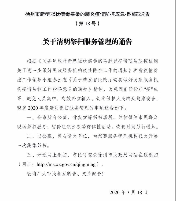 现将徐州市新型冠状病毒感染的肺炎疫情防控应急指挥部发布的《关于清明祭扫服务管理的通告》转发给你们,请积