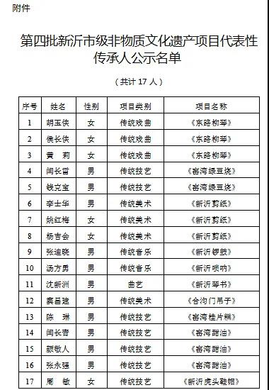 为有效保护和传承非物质文化遗产,鼓励和支持非物质文化遗产项目代表性传承人开展传习活动,按照新沂市文体广电和旅游局2019年12月印发的《关于申报第四批新沂市级非物质文化遗产代表性项目传承人的通知》(新文体广旅〔2019〕95号),根据各镇(办)、各单位推荐,经评审,现将拟定的第四批新沂市级非物质文化遗产项目代表性传承人共17人进行公示。