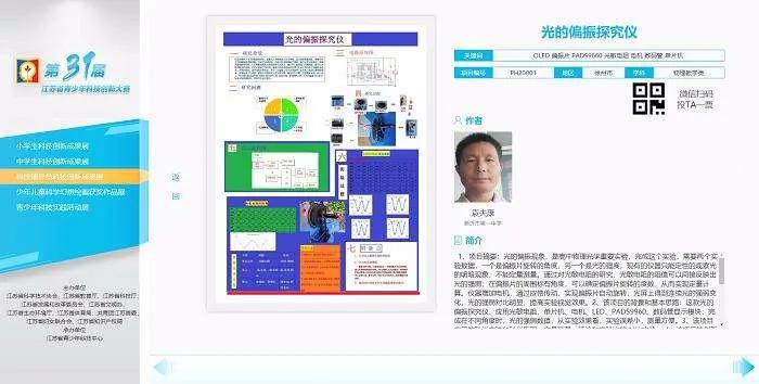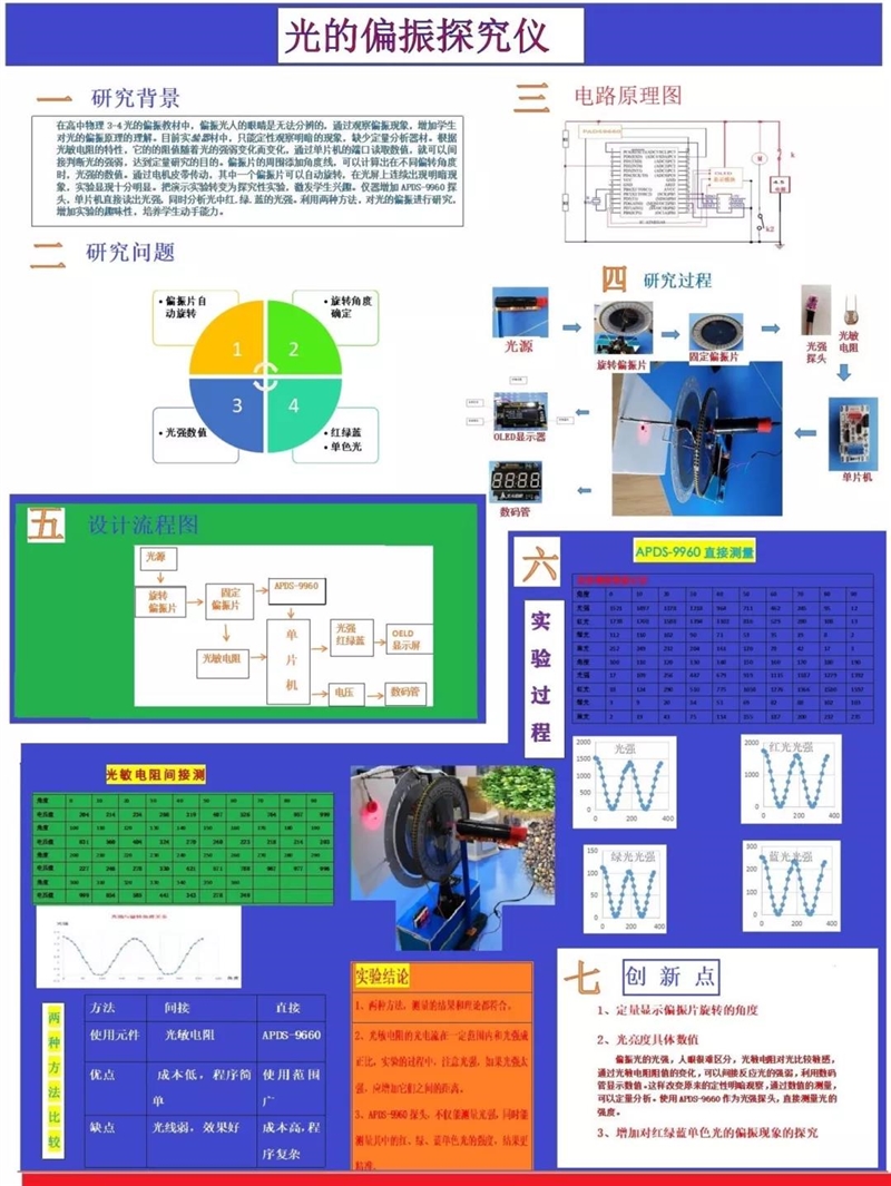 这款光的偏振探究仪,应用光敏电阻、单片机、电机、LED、PADS9960、数码管显示模块,完成在不同角度时,光的强弱数值,从实验效果看,实验误差小,测量方便。