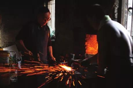 窑湾诸业发达,铁匠铺子不少,但自开业到如今,从未停过炉的只有颜家铁匠铺。从其师祖太爷王荣坤算到现在的传人颜振中和颜振,已是九代了。颜家铁匠铺是一家铁工作坊,一直靠传统工艺生产。用原始的手拉风箱,用铁锤在铁砧上煅打,用祖传的方法淬火。但他们制出的刃具竟比享誉中外的“扬州三把刀”还锋利。革命战争年代,店主颜士先曾为徐玉珍的马陵大队打过鬼头刀,专割小日本的脖子。打刀的材料,都是游击队扒来的铁轨,所以既锋利,又坚硬。如今一家十口,三世同堂。饭桌前贴着佛家警世语“人生二十最”每天念一遍。用最朴素的方法教育子女,爱党、爱国家,诚信做人。