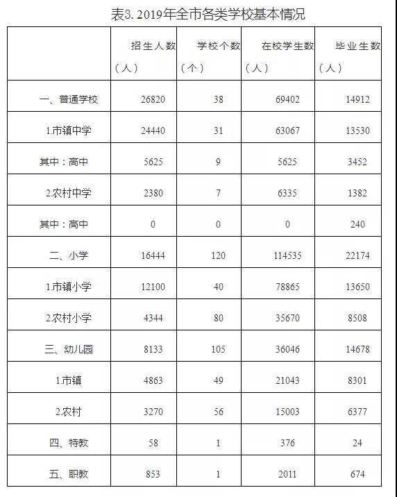 全市中小学在校学生184262人,其中中学69402人,小学114535人。特教学校在校生376人,中等职业学校在校生2011人,幼儿园在园幼儿36046人。