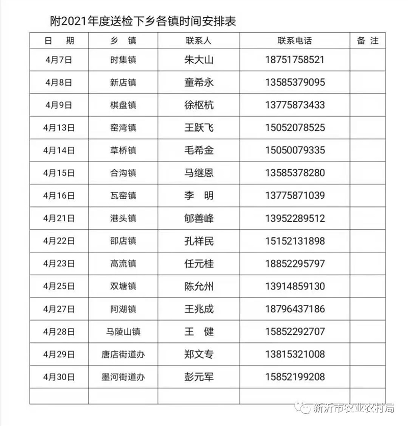 新沂市农机监理所自2021年4月7日起至夏季农忙前,组织工作人员对新沂辖区内拖拉机和联合收割机进行春季“送检下乡”活动,为切实做好为农民服务工作,农机监理所工作人员自己多跑路,让广大农民少跑路,将农业机械年度检验送检到镇、送检到合作社、农机大户,同时协调农机管理科、保险公司、石油公司、移动公司,实行农机跨区作业证、农机政策性保险、双优加油卡、平安农机通一站式服务。2021年送检下乡工作时间表已经做好安排(见附表)。