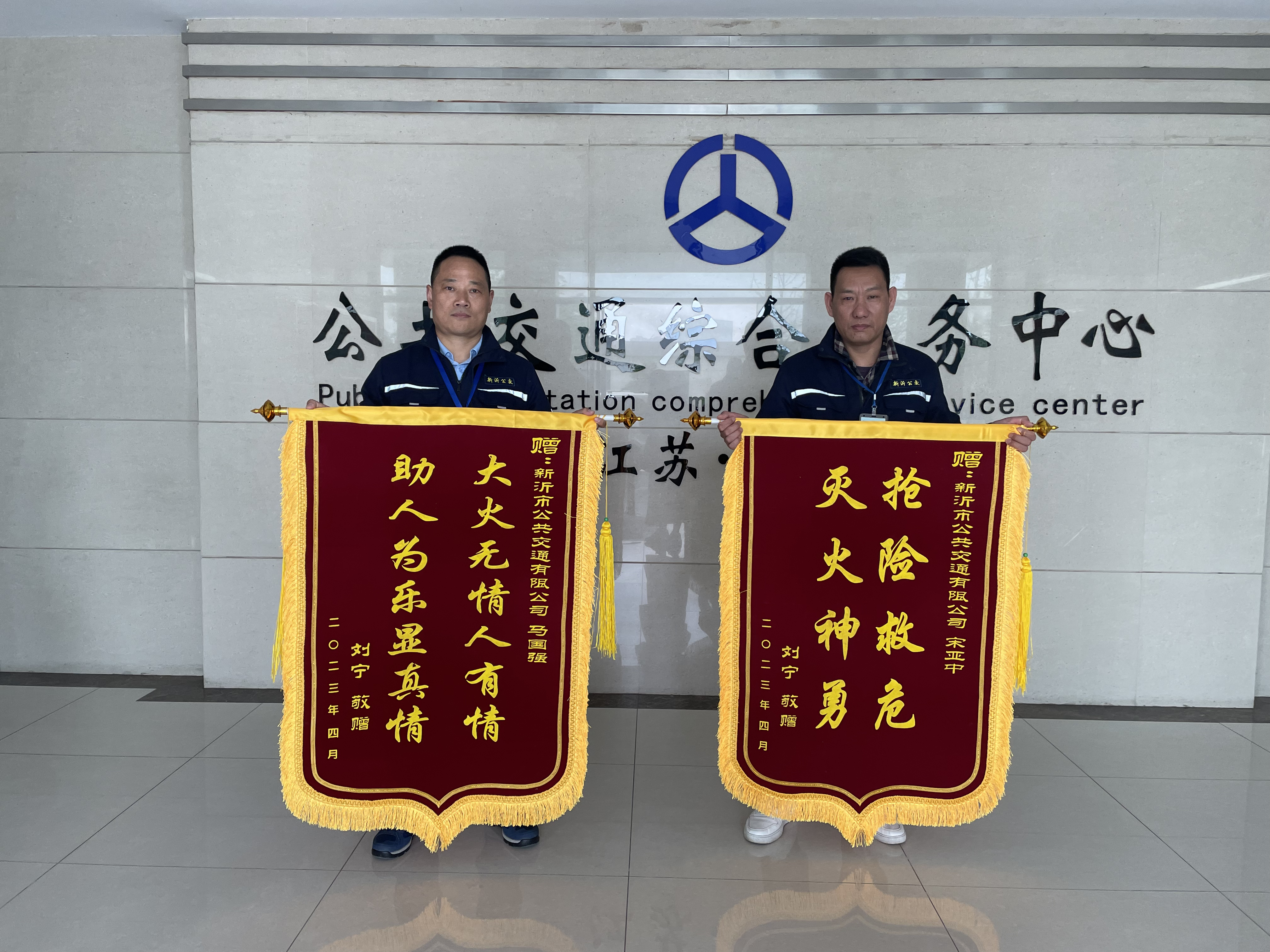 4月25日一大早,混凝土搅拌车驾驶员就来到公交公司并将两面写着“大火无情人有情,助人为乐显真情”、“抢险救危,灭火神勇”的锦旗送到公交车司机马国强、宋亚中的手中,向他们英勇救火的善举表示感谢。