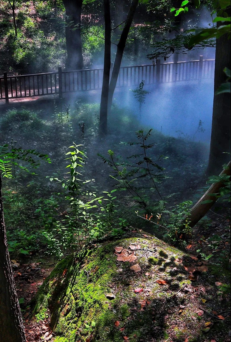 清晨,山间弥漫着轻雾,罩着一片耀眼的青绿