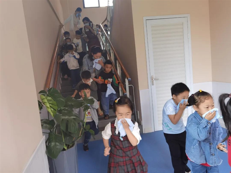 9:40左右,忽然响起紧急的警报声,各班教师第一时间组织孩子们进行疏散逃生,指导幼儿拿起湿毛巾,捂住口鼻,迅速、有序地撤离到安全地带。 很快孩子们集中到操场安全地带,教师迅速地清点人数,并向总指挥报告。