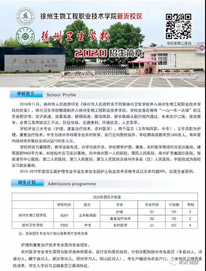 招生对象为2020年应届初中生,需符合医学类体检要求,户籍必须为新沂市农业户口。