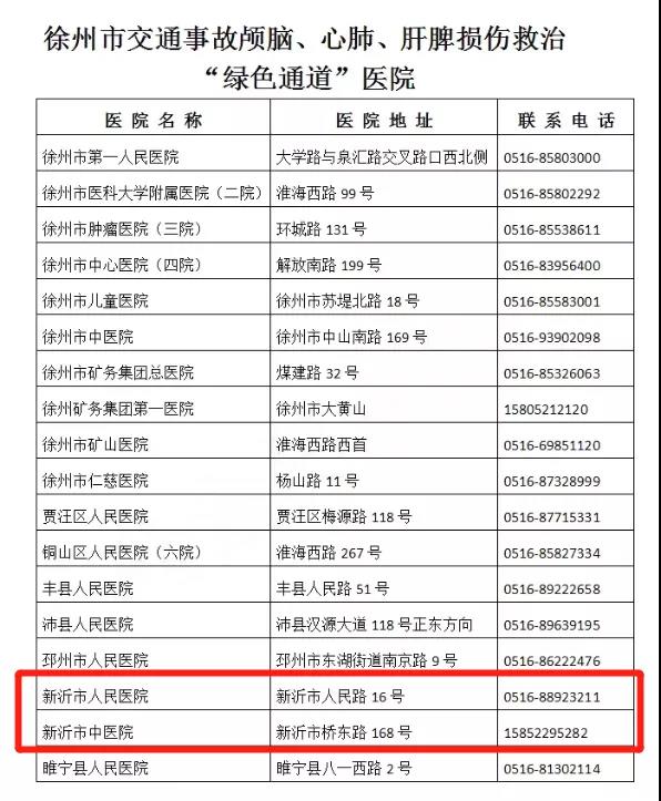 为进一步加强道路交通事故受伤人员的紧急医疗救治工作,开辟交通事故救援救治“绿色通道”,实施快速精准有效救治,避免延误救治时间,降低交通事故死亡率和死伤比,全力保障人民群众生命安全,经市公安局与市卫生健康委研究,确定了徐州市第一人民医院等18家交通事故救治“绿色通道”医院(附件1),选拔聘请全市急诊科、骨科、神经外科、心脏外科、普外科、重症医学科等学科领域专业技能优秀、实践经验丰富的422名专家、骨干医师组成全市交通事故重伤员医疗救治专家库(附件2),现向全社会公布,我市境内发生致人员受伤的道路交通事故,根据事故发生地域、事故严重程度、受伤人员损伤等实际情况,合理选择医疗机构开展救治工作。