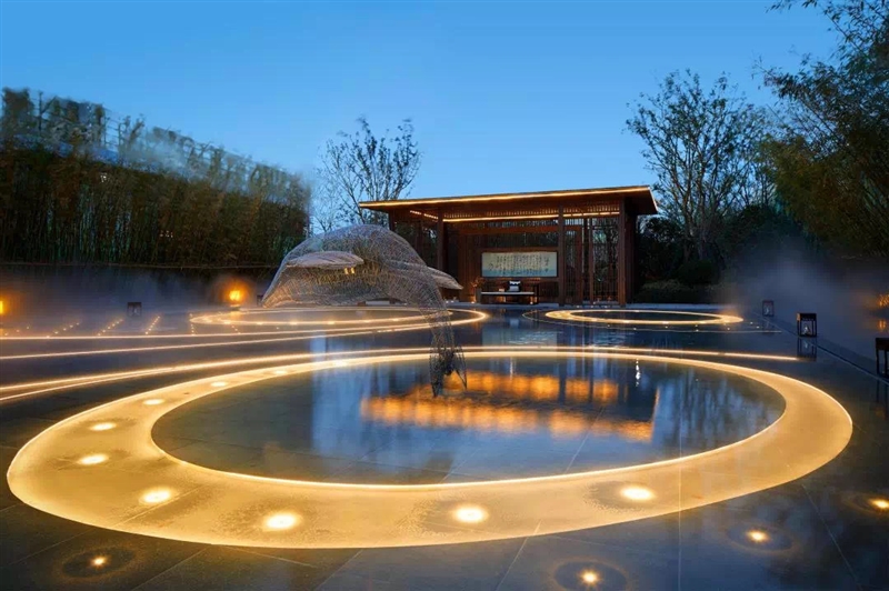 竹林夹道结合韵味灯具,增强了归家仪式感,迎来送往,皆显尊荣。庭院之内,园林的设计来源于自然,因地制宜还原自然本色。山川景墙以水墨意蕴,将自然山川的秀美印刻于景墙,绘就山水画卷,意境深远。门廊转换间闲庭信步,怡然自得,动静结合的视野格局,带来雅奢体验。