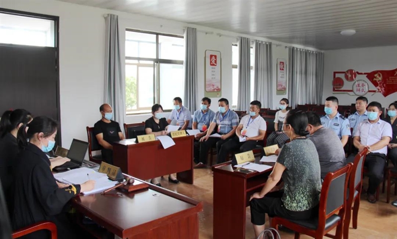 7月27日,新沂法院双塘法庭法官走进高流镇石涧村,巡回审理一起案件,现场邀请高流镇4名人大代表、政协委员以及部分当事人亲属旁听庭审。