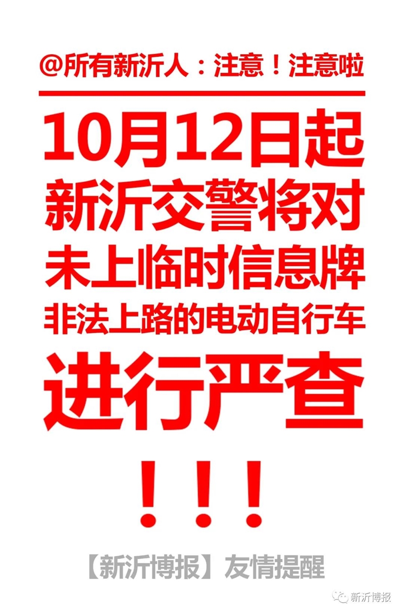 为有效预防和减少道路交通事故发生,进一步净化道路交通安全环境,新沂交警大队自10月12日起,将加强路面执勤检查, 在全市各大路口、主要道路, 严格查纠未上临时信息牌违法上路行驶的电动自行车。