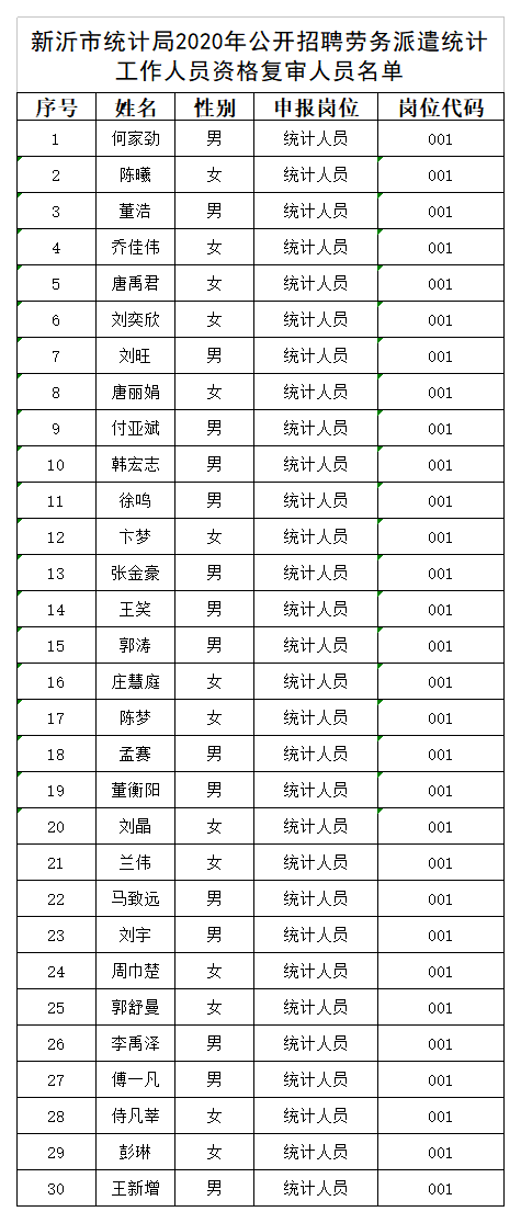新沂市统计局2020年公开招聘劳务派遣统计工作人员笔试成绩公示已结束,从应聘该岗位笔试成绩合格人员中,按笔试成绩从高分到低分的顺序,按不超过拟招聘人数1:3的比例确定参加资格复审的人选(末位成绩并列的